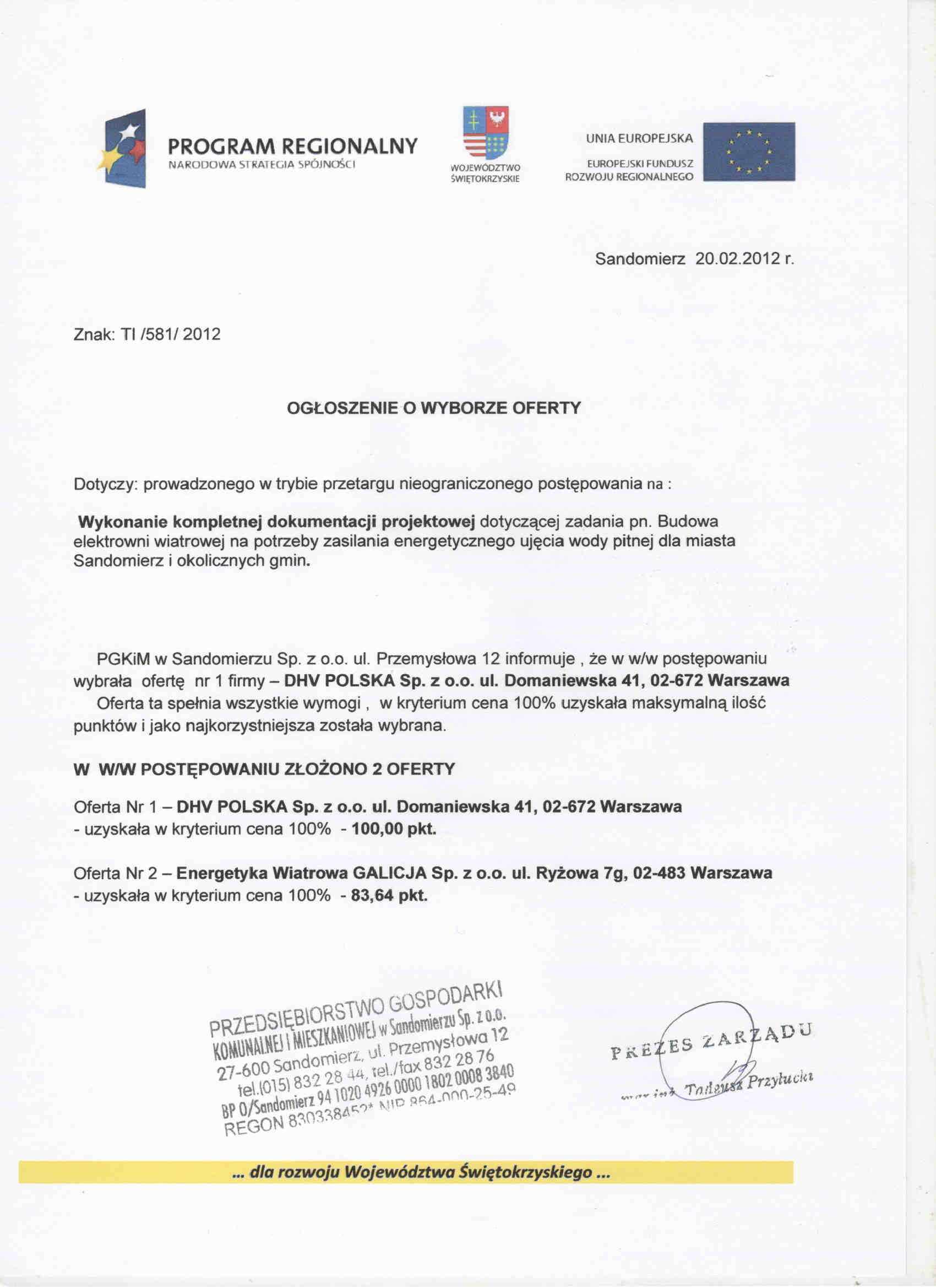 PGKiM w Sandomierzu Sp. z o.o. ul. Przemysłowa 12 informuje , że w w/w postępowaniu wybrała ofertę nr 1 firmy – DHV POLSKA Sp. z o.o. ul. Domaniewska 41, 02-672 Warszawa