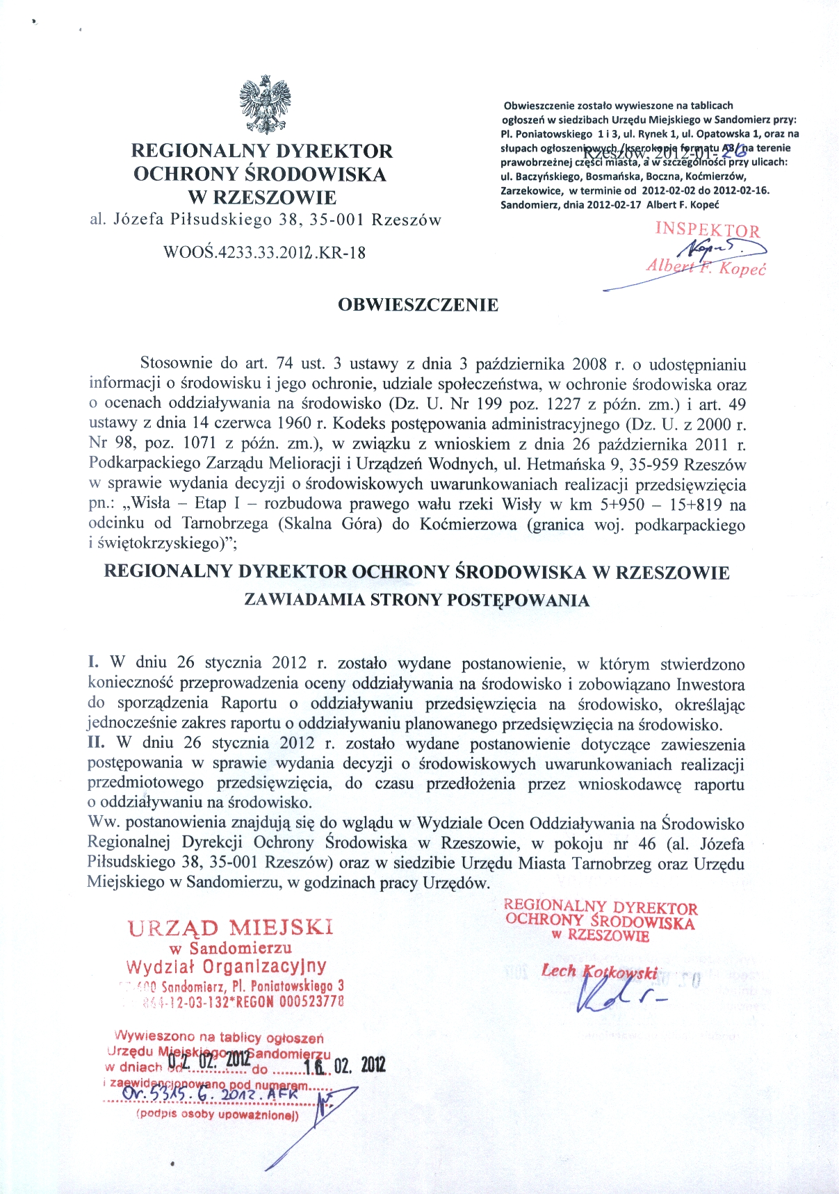 "Wisła - Etap I - rozbudowa prawego wału rzeki Wisły w km. 5+950 - 15+819 na odcinku od Tarnobrzega do Koćmierzowa", że w dniu 26 stycznia 2012 r. zostało wydane postanowienie, w którym stwierdzono konieczność przeprowadzenia oceny oddziaływania na środowisko.