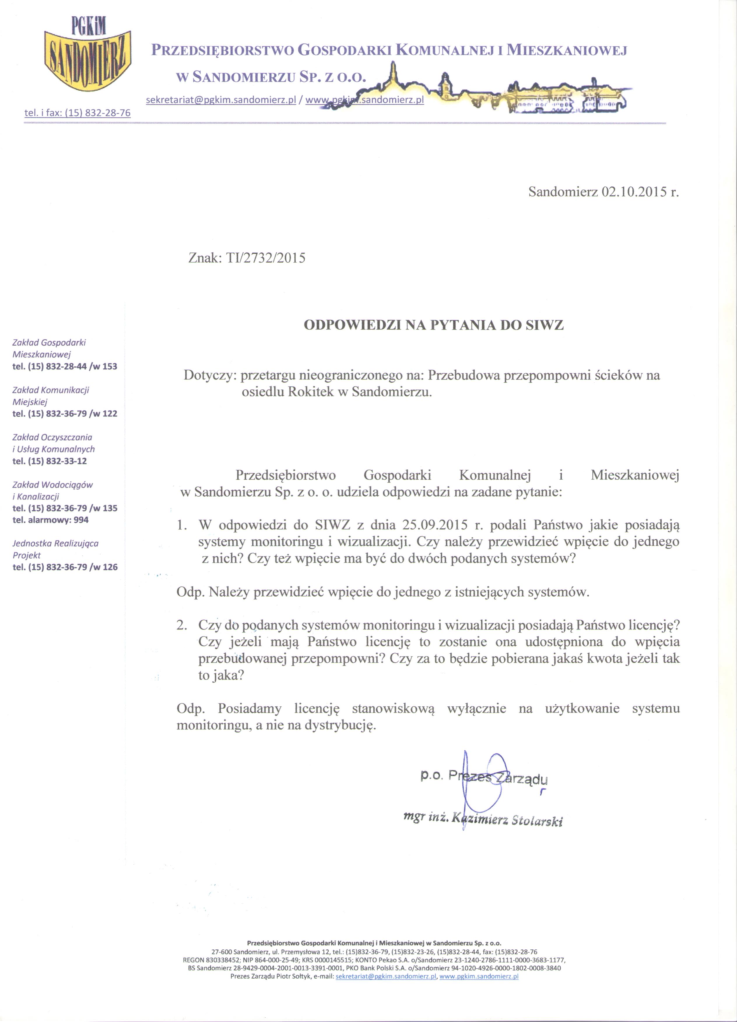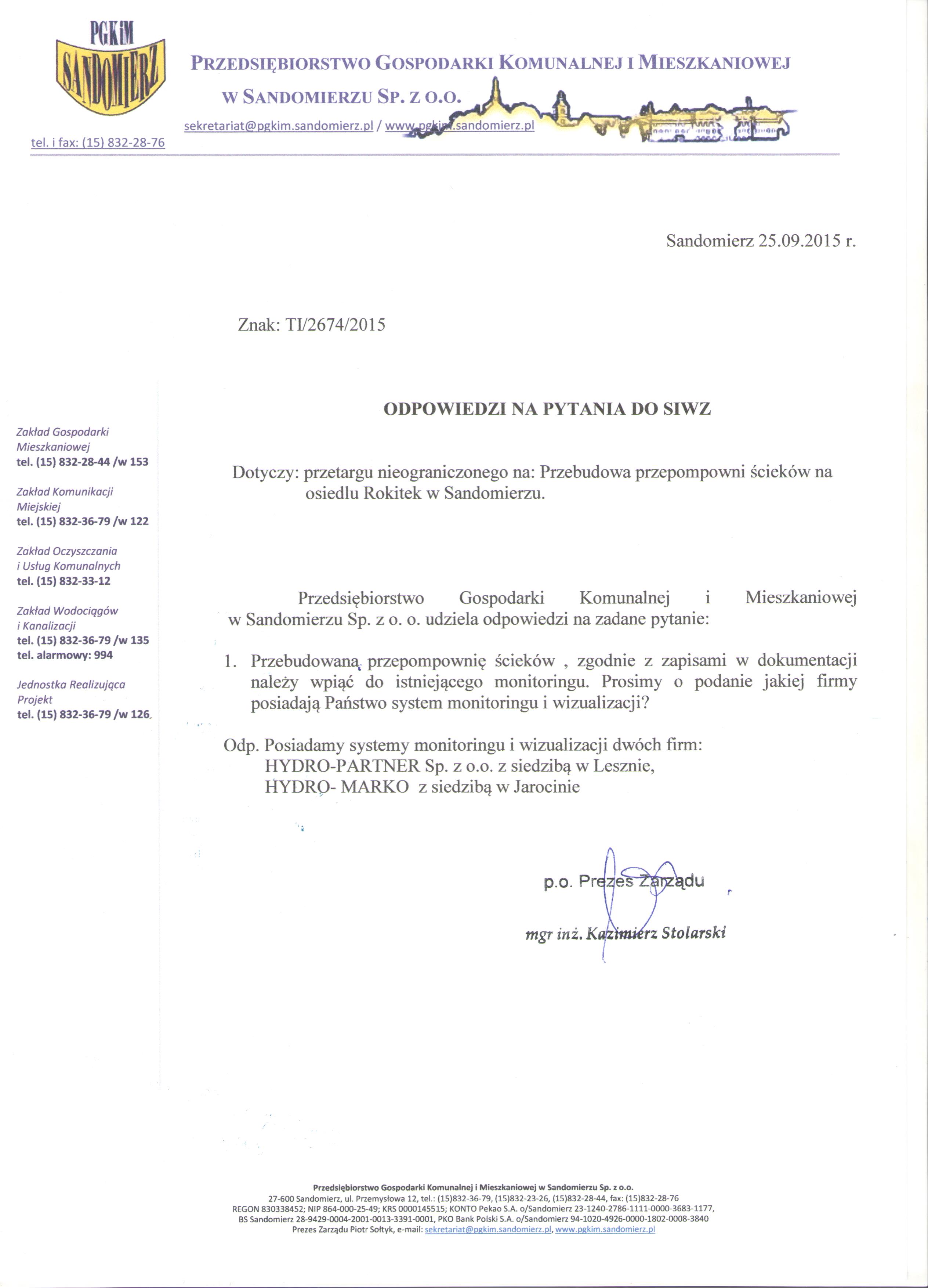 I. 1) NAZWA I ADRES: Przedsiębiorstwo Gospodarki Komunalnej i Mieszkaniowej sp. z o. o. , ul. Przemysłowa 12, 27-600 Sandomierz, woj. świętokrzyskie, tel. 015 8322844, faks 015 8322876.