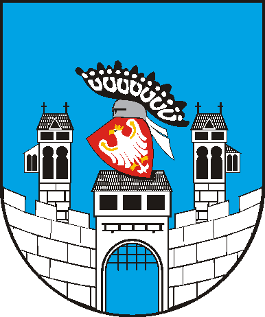 - mur miejski z ciosanych kamieni, zwieńczony sześcioma silnie akcentowanymi blankami fortecznymi, z szeroką, o łukowym sklepieniu bramą pośrodku, w której widnieje podniesiona do połowy wysokości brona. Nad bramą szeroka strażnica o trzech prostokątnych okienkach, zakryta ściętym trapezowym dachem. Za murem zarysowanym łukowo, w perspektywicznie oddanym pierścieniu, wznoszą się po bokach dwie czworokątne wieże: każda o dwóch gotyckich oknach, z przybudowanymi od zewnątrz alkierzami, nakryte wielospadowymi dachami. Pośrodku, między wieżami, nad strażnicą, zawieszona w pozycji nachylonej (w prawo) duża tarcza z ukoronowanym orłem piastowskim, a na jej lewym narożu osadzony hełm rycerski z powiewającymi od tyłu labrami, zdobny w duży, wachlarzowato rozwinięty, podwójny pióropusz pawi.